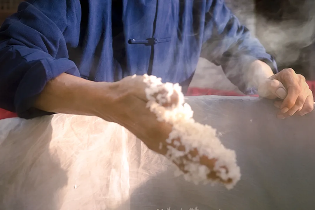 冬酿米酒的诞生,聚集了天时、地利与人和。酿酒从秋天降温后开始,越是冷冽的天气,越利于微生物的发酵。酿酒的糯米是太湖单季糯米,一年只产一季,米香质软,晶莹饱满,曾是明清贡品,成本比普通大米要高。民间传统酿造工艺不过五六道工序,但这瓶米酒则要经过浸米、蒸饭、淋饭、拌曲,糖化、发酵、取酒、陈化、出酒、存放等整整15道工序,诸多讲究。例如,酒厂拌曲时,多用全自动机器蒸饭机,发酵过程透气性差,糖化程度不均匀,酿出的酒会有苦味杂味。钱义兴酒坊则坚持手工将蒸熟的糯米细心分开,让其充分糖化。这样做耗时耗力,但成品杂味少,香甜度也更高。米酒的风味多附着在酒糟纤维,酒坊还以特殊工艺将酒糟成分打碎,保留微颗粒,增添了黏稠度,同时剔除较大颗粒,让液体更丝滑细腻,也让米香更浓郁。酿造全程,不加入香精、色素、防腐剂,用工艺的讲究,酿出纯粹的米酒原浆。苏州的冬酿,柔润甘甜,温暖过冬