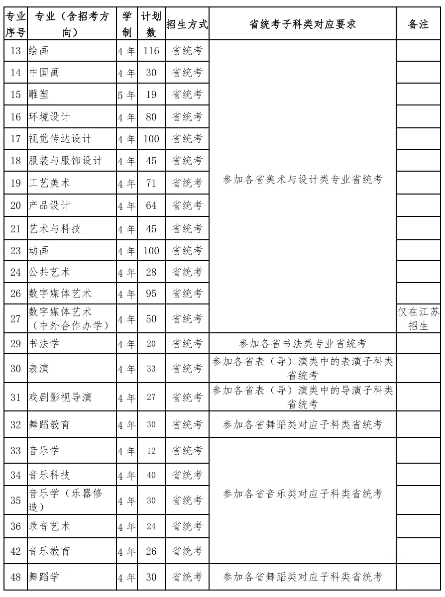 (二)艺术类批次录取专业(专业成绩使用省统考成绩)