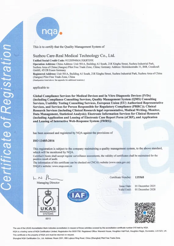 正值辞旧迎新,在2026年伊始,科睿医疗获得NQA颁发的ISO 13485:2016医疗器械质量管理体系认证证书。这标志着科睿医疗在海外临床研究、海外法规服务方向持续提供高质量技术服务。