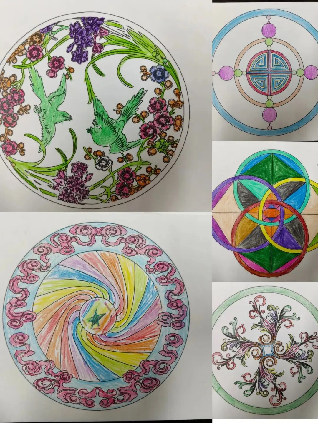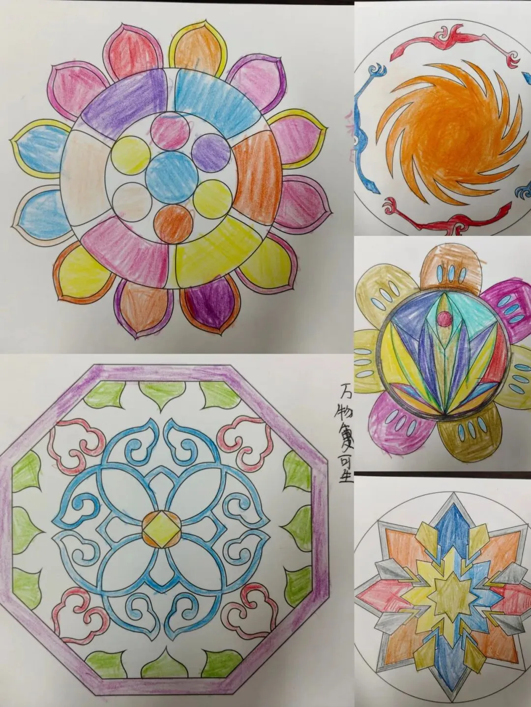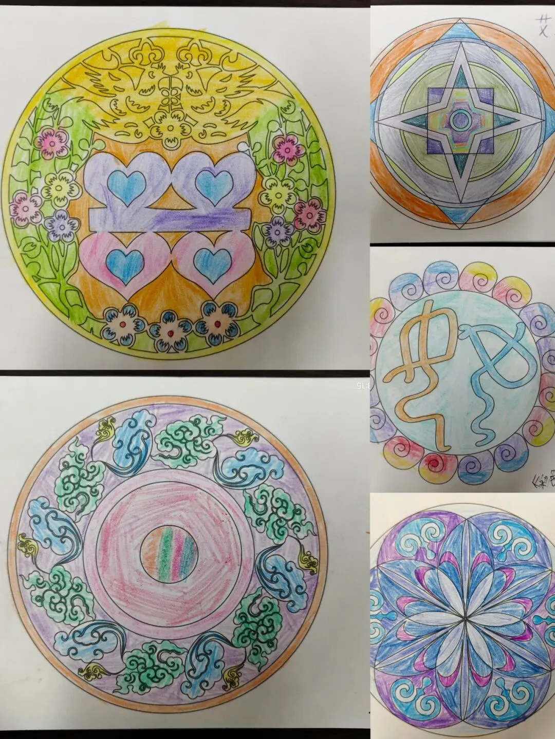 刘娟老师引导学生沉浸于曼陀罗绘画的结构化框架中。这一形式如同安全的“容器”,承接并释放情绪。学生以画笔对话自我,用色彩描绘心绪,在专注创作中体验内心的秩序与平和,提升专注力与创造力。