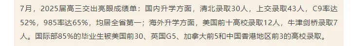 2025届高三交出亮眼成绩单:国内升学方面,清北录取30人,上交录取43人,C9率达52%,985率达65%,均居全省第一;海外升学方面,美国前十高校录取12人,牛津剑桥录取7人。