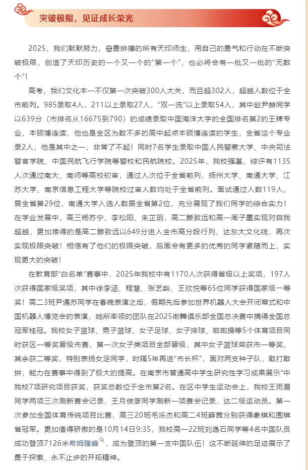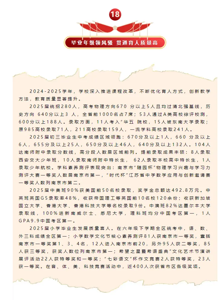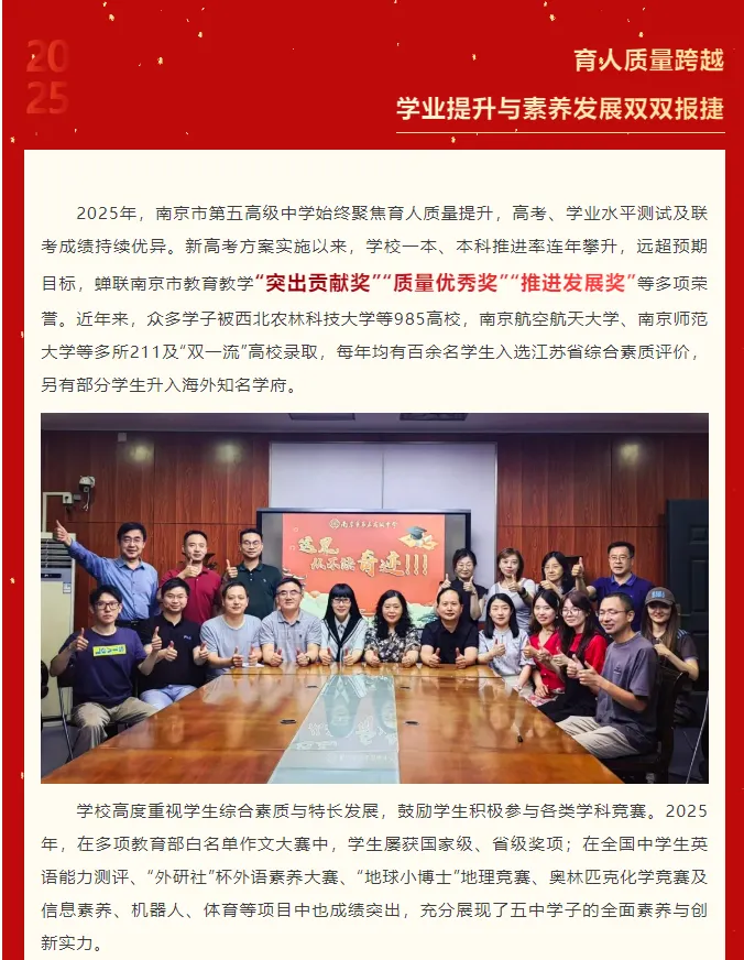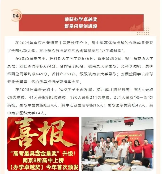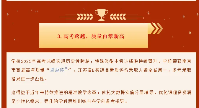 学校2025年高考成绩实现历史性跨越。特殊类型本科达线率持续攀升,学校荣获南京市首届高考质量“卓越奖”,江苏省B类综合素质评价录取人数全省第一,多元录取格局进一步凸显。