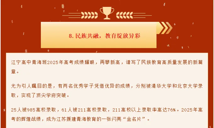 25人被985高校录取,61人被211高校录取,211高校以上录取率高达76%。2025年高考的辉煌战绩,成为江苏援建青海教育的一张闪亮“金名片”。