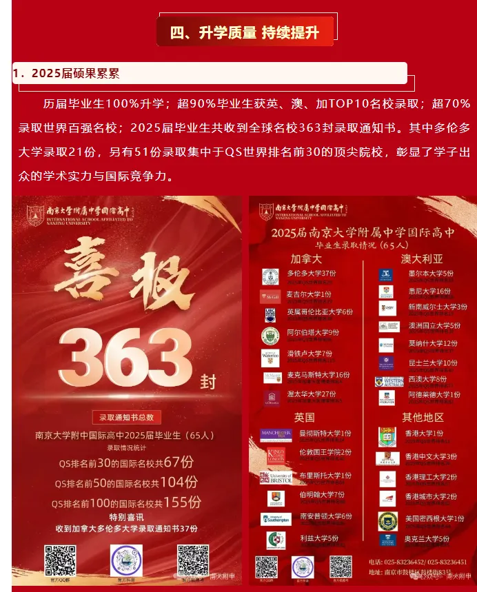 历届毕业生100%升学;超90%毕业生获英、澳、加TOP10名校录取;超70%录取世界百强名校;2025届毕业生共收到全球名校363封录取通知书。