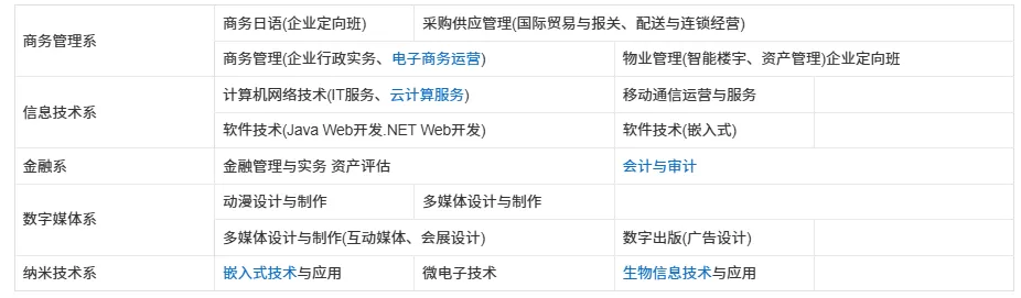 信息技术类:软件技术、计算机网络技术、大数据技术等,是国家示范专业,与IBM、华为等大厂有合作。