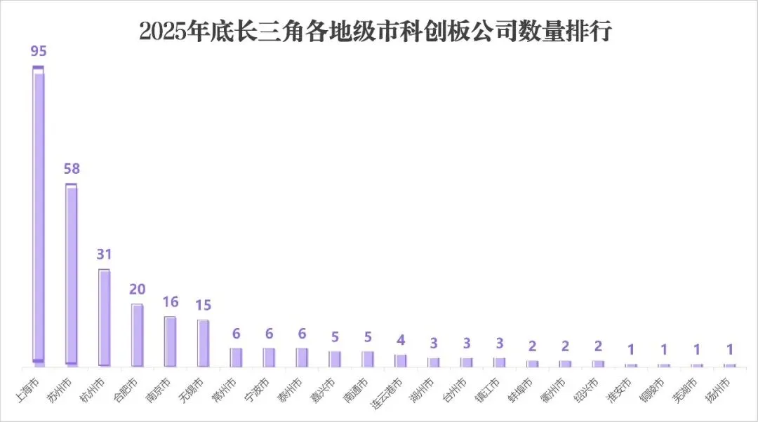 在长三角城市排名中,苏州的科创板公司竟然多达58家,仅次于上海;杭州有31家,位居第二,但是比苏州少很多了。