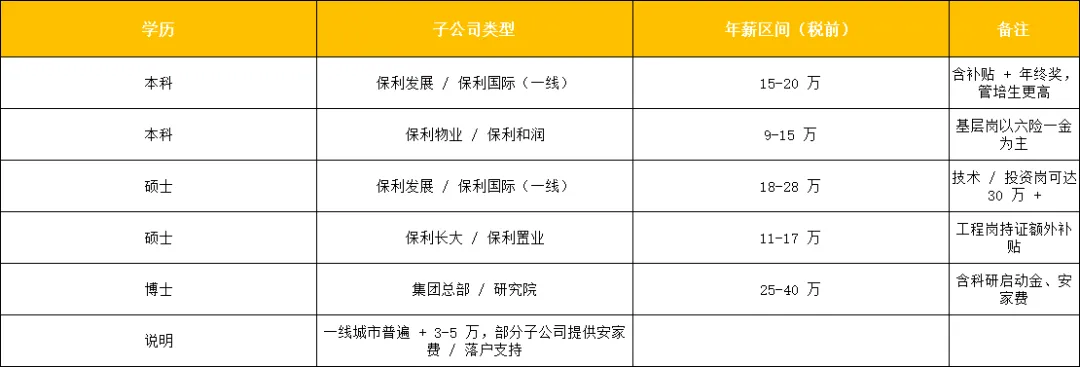 4. 特色岗:剧院 / 文旅运营岗 12-18 万 / 年,持证(如一级建造师)补贴 3 万 / 年;驻外岗额外 + 20%-50% 补贴。