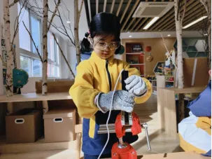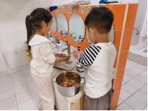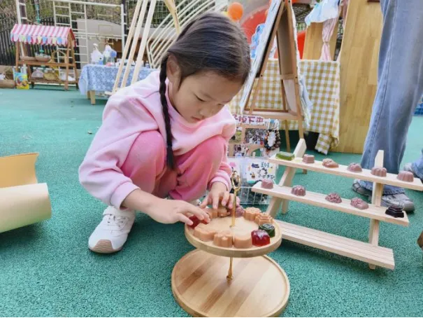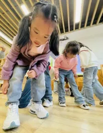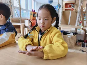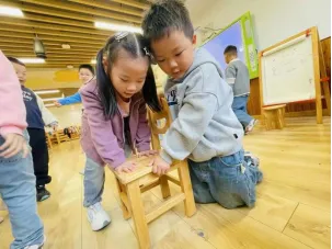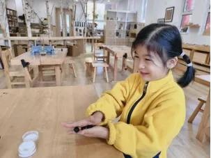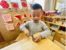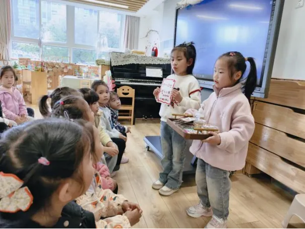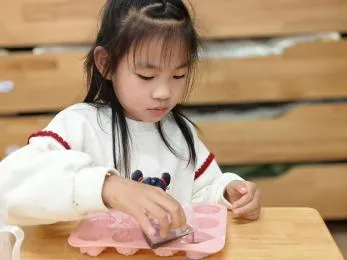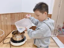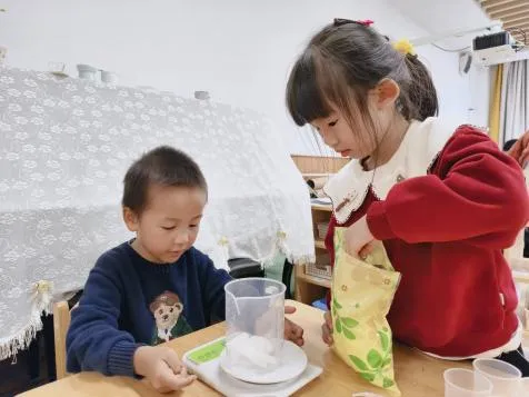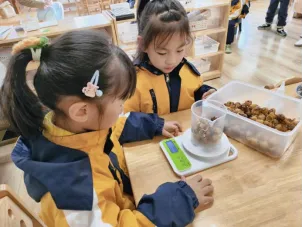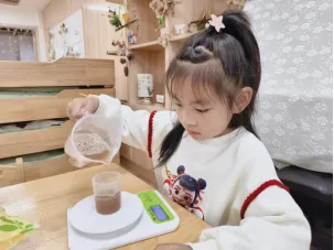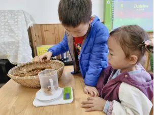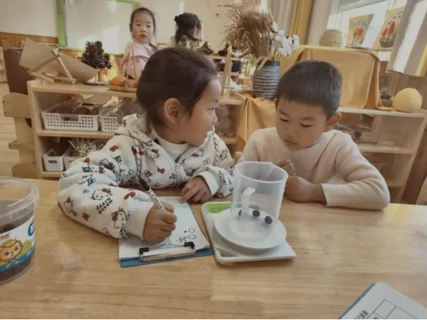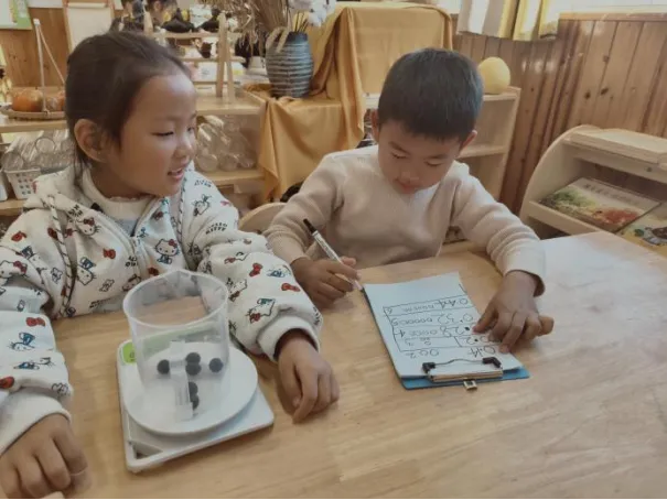 在工具的使用过程中,孩子们借助老师和小伙伴的帮助,反复尝试,从不会使用电子秤到掌握称重要点,初步学会精准读取克重。