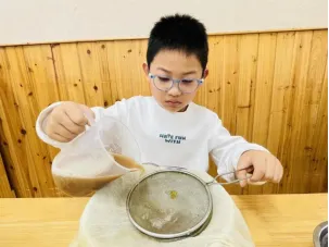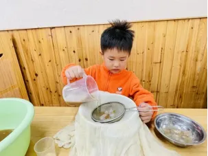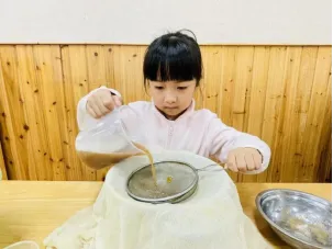 静置之后孩子通过对比观察,发现用纱布和滤网勺放在一起过滤后无患子汁液会更加干净,其他两种过滤工具都会存在杂质。经过一轮探索之后,大家决定使用这种办法进行过滤,又快又干净真是不错呀。