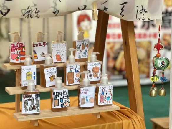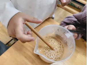 洗手液稀薄如水,搓揉许久也不见泡沫产生。孩子们满是疑惑:“为什么我们的洗手液不行呢?”“是不是我们步骤出错了?”“无患子洗手液下面好像有很多渣渣?”