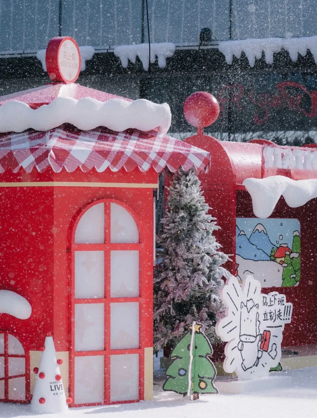 1000㎡童话雪景小镇空降南京,红色的小房子超级亮眼和冬天的氛围超搭,地上铺满了厚厚的冰雪,冬日气氛浓厚。当漫天的雪花飘落时,纷纷扬扬的落在地上超级浪漫的。