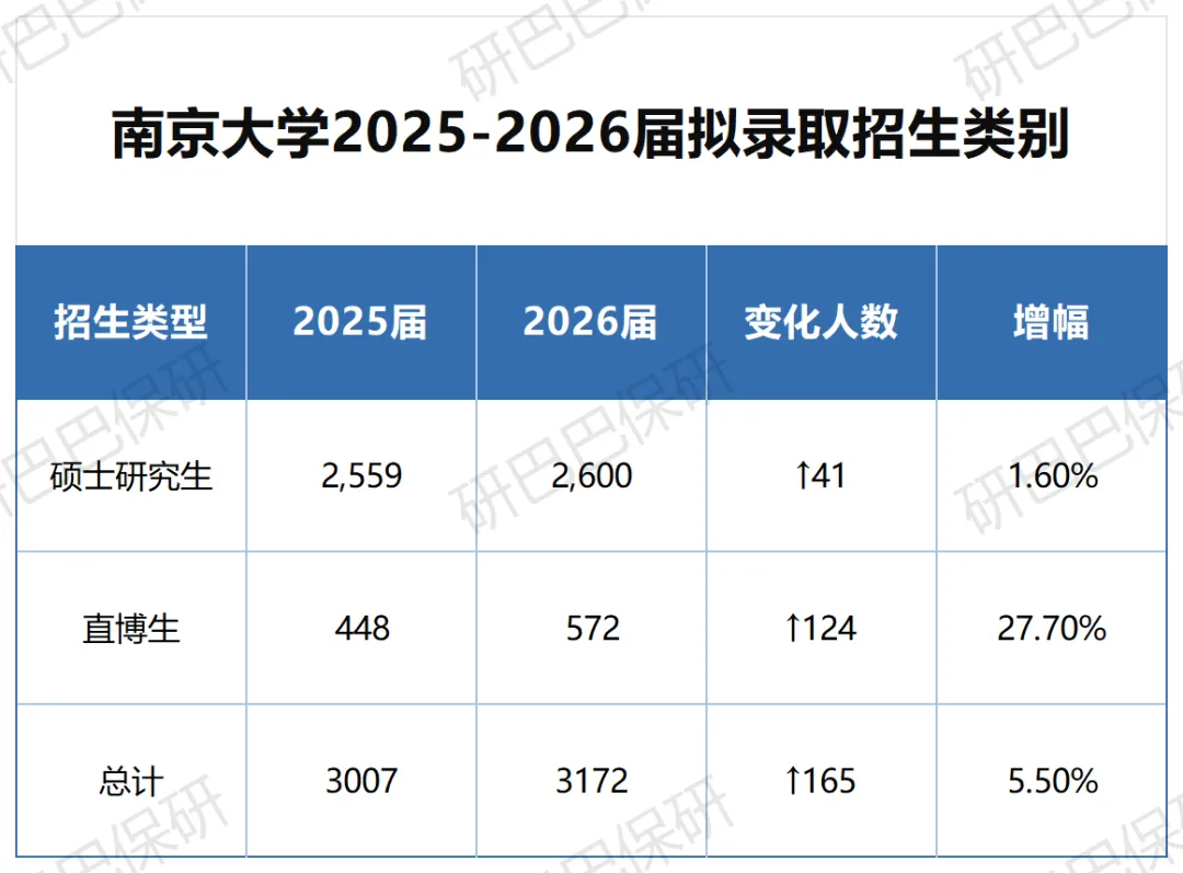 2026届拟录取总人数达3172人,相较2025届的3007人增加165人,增幅5.5%。下表为2025-2026届推免拟录取招生类别对比,数据整理自南京大学研究生院公示文件: