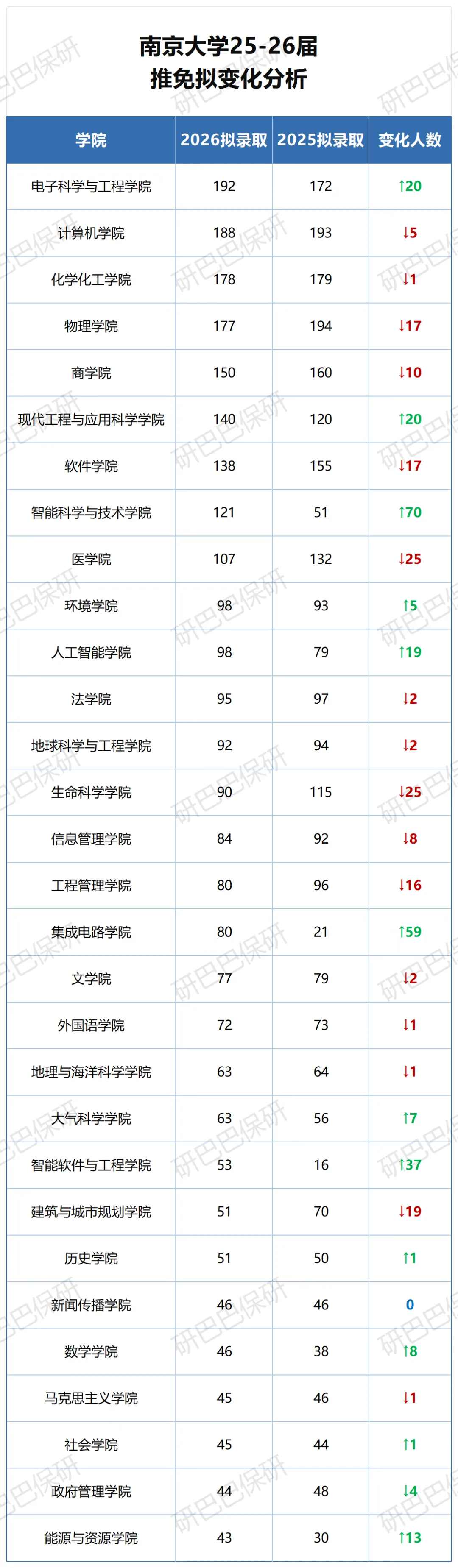 下表为2025届南京大学保研核心数据(含指标分配、学院变动细节),来自南京大学研究生院及研巴巴保研统计: