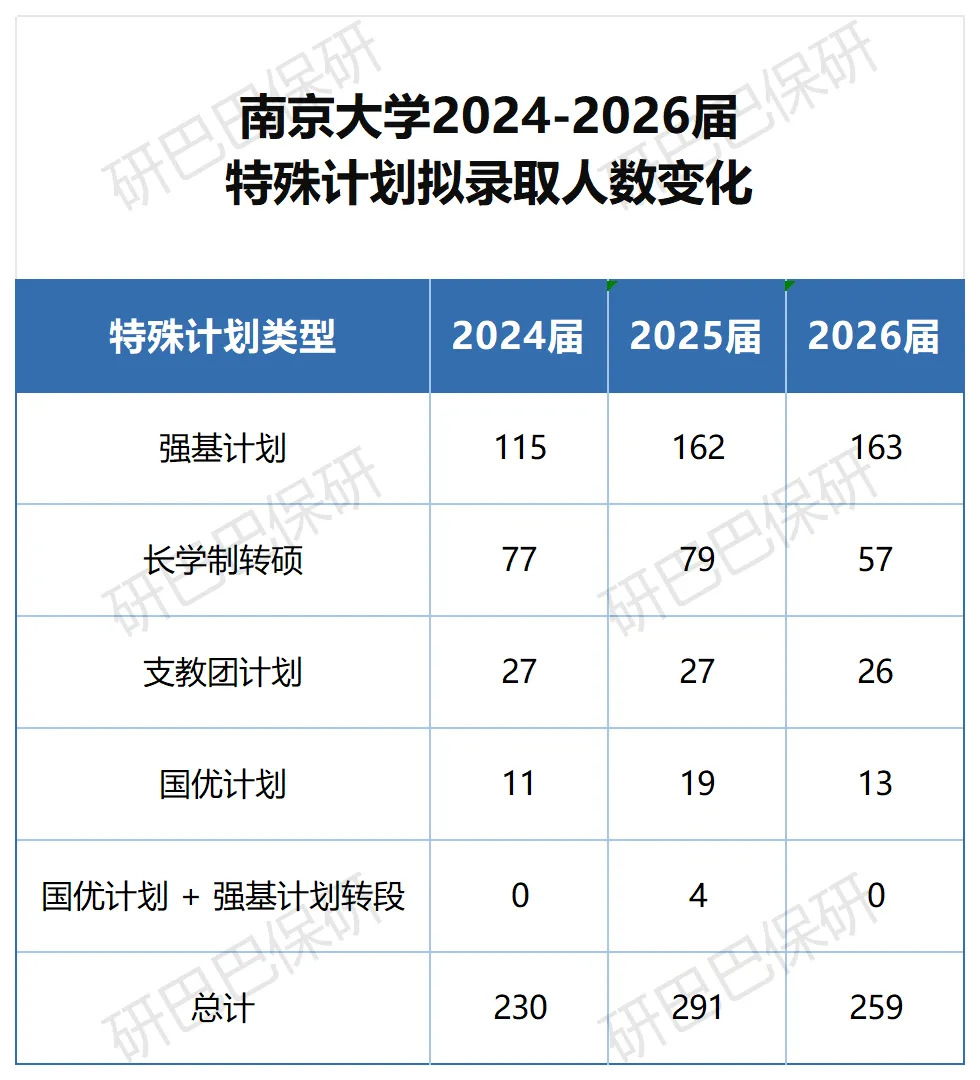 南京大学近三届“特殊计划”推免录取人数围绕250人波动,2025届达近年高点(291人),2026届因长学制转硕收缩回落至259人。下表为2024-2026届特殊计划拟录取完整数据: