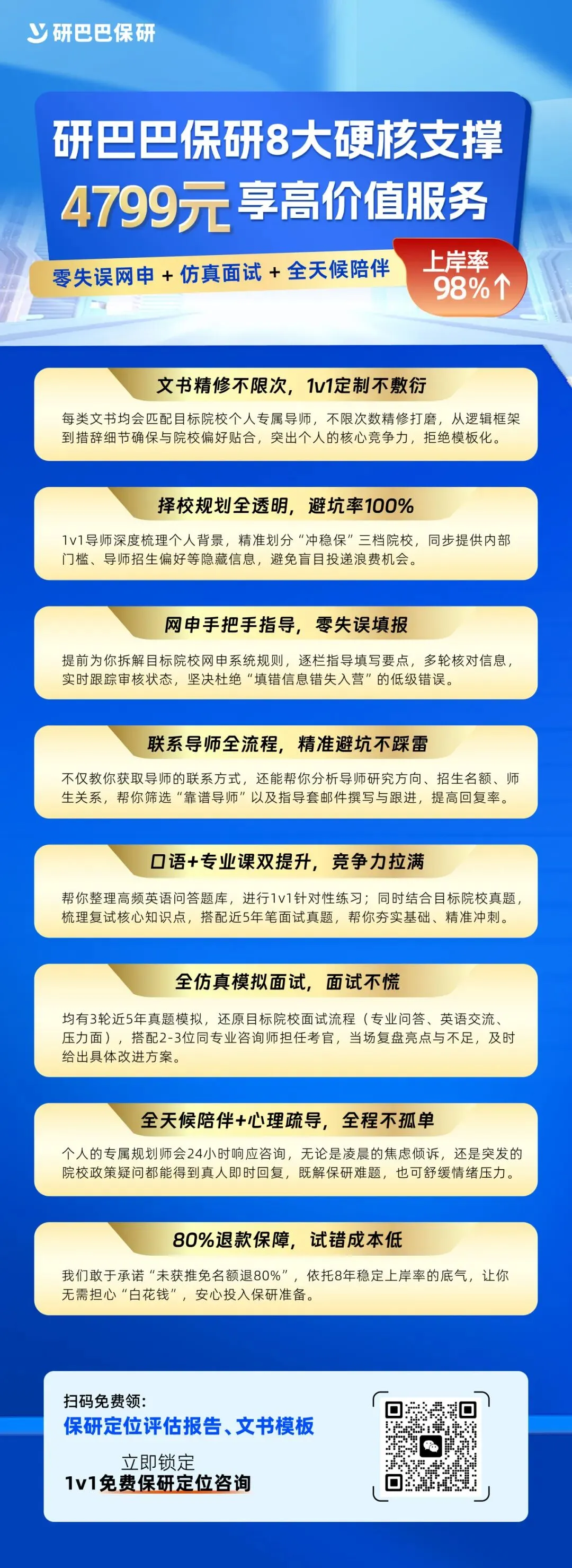要是大家对上面这些内容感兴趣,不妨扫码咨询保研顾问,发送关键词【保研全程】。不管你最终是否报名,都能免费获取大学生保研规划方案以及大学全科备考资料。