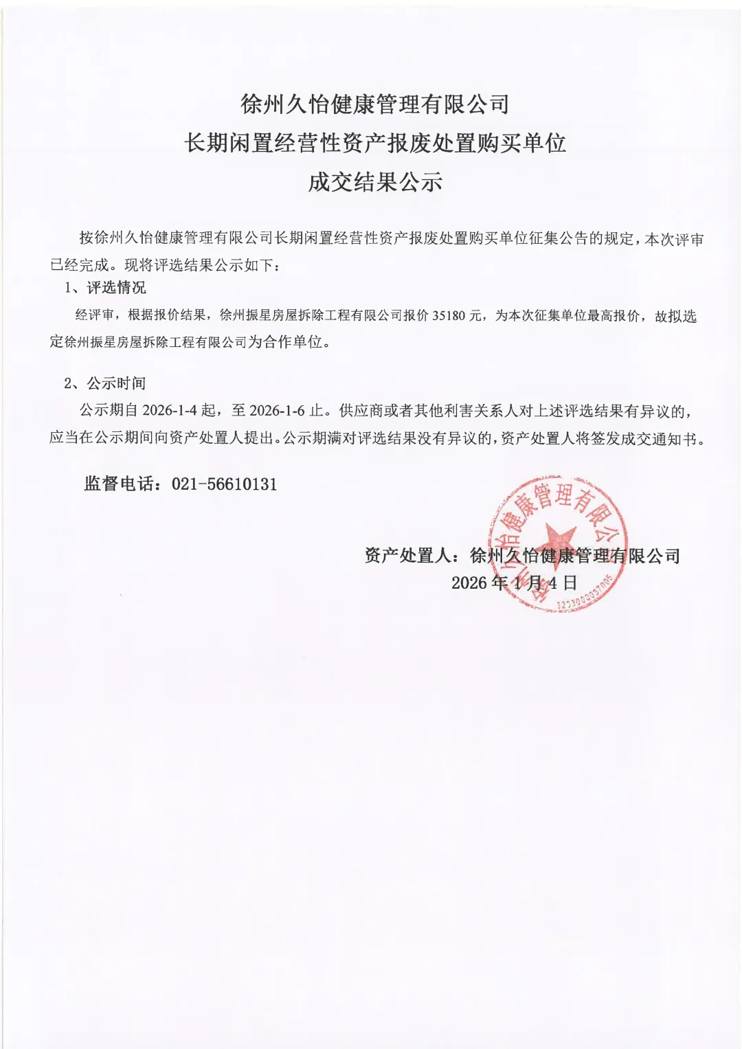 徐州久怡健康管理有限公司长期闲置经营性资产报废处置购买单位成交结果公示