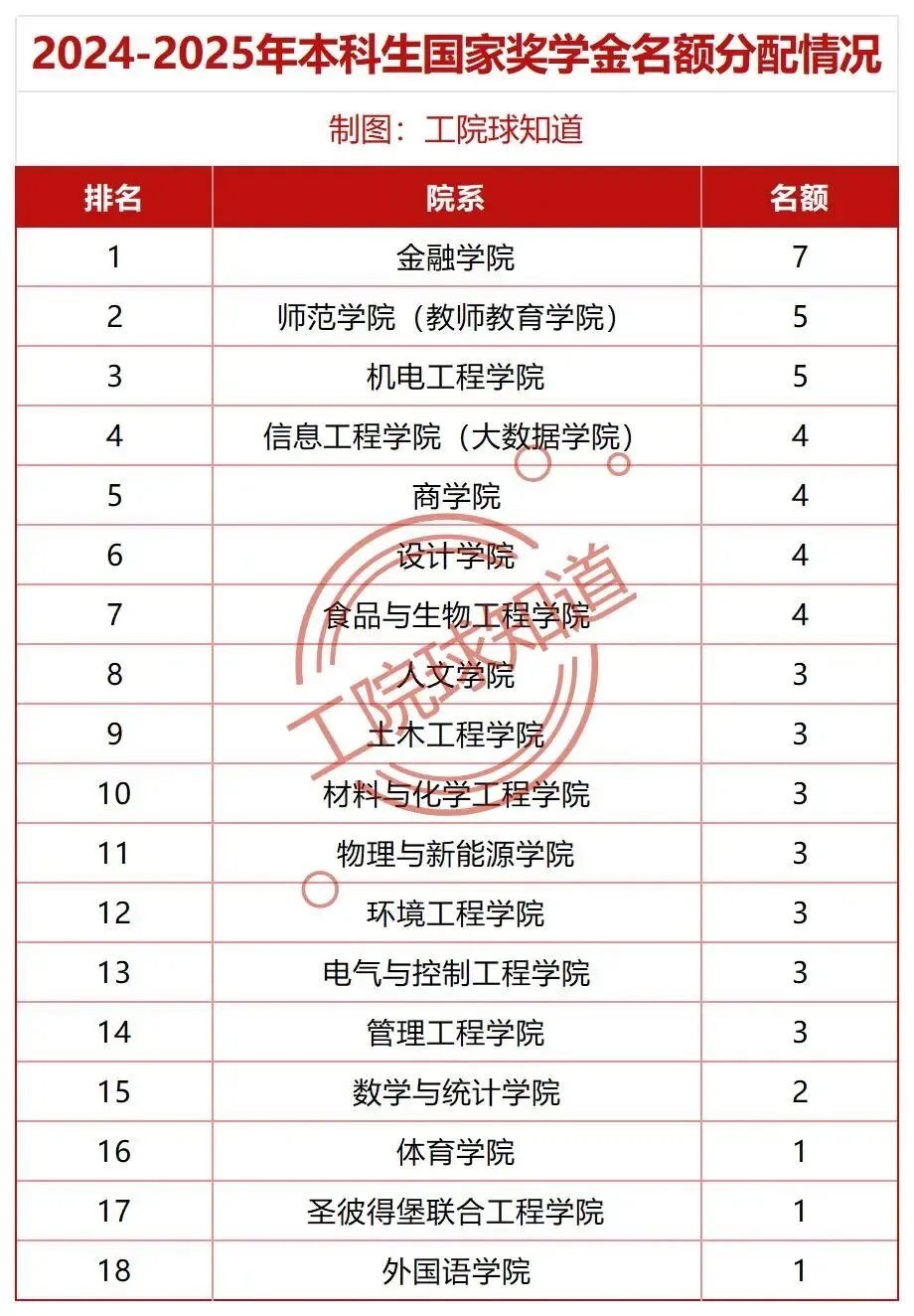 为国奖名额最多的学院。师范学院(教师教育学院)和机电工程学院并列紧随其后,具体分配情况如何,请看下表统计: