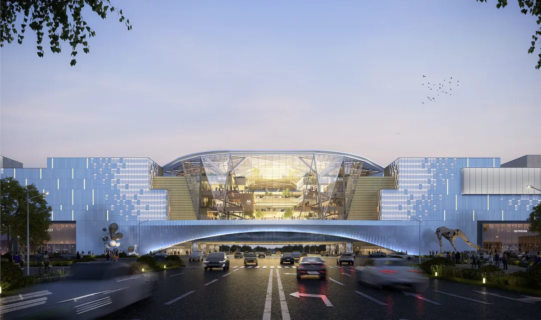 该项目由北京新鑫兴业房地产开发有限公司开发,总用地面积4.16公顷,总建筑面积达21.46万平方米,其中商业建筑面积近14万平方米。建筑设计上,项目采用“地上5层+地下3层”结构,东区侧边做退层处理以丰富立面形态;两大地块间将架设跨街式连廊,以不规则多边形结合大面积玻璃幕墙打造“钻石质感”造型,成为区域视觉焦点。