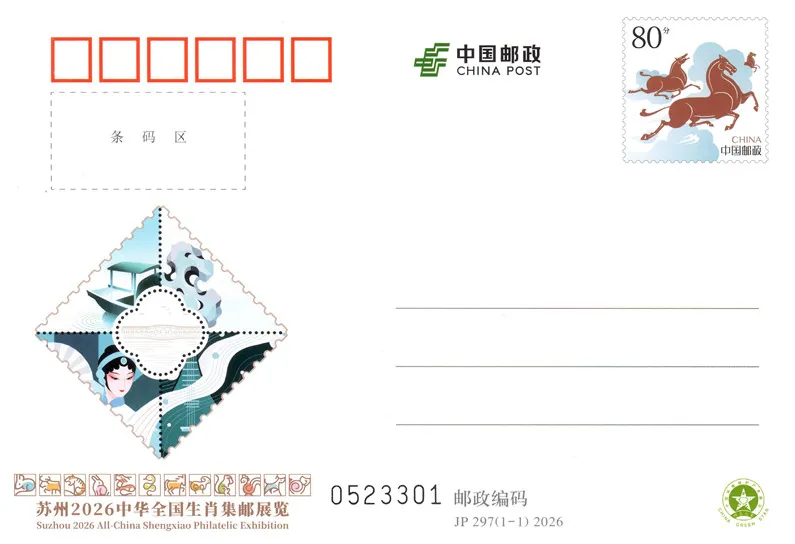 “苏州2026中华全国生肖集邮展览”今天在江苏苏州吴文化博物馆举行。为配合这次集邮展览,邮政部门发行纪念邮资明信片一套1枚。