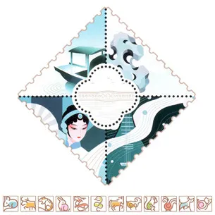 菱形中左下方,为一戏曲人物。推测是梅兰芳艺术剧照。梅兰芳祖籍是江苏泰州,1933年1月,梅兰芳应苏州公益慈善筹款演剧会邀请,在苏州开明大戏院(当时名为东吴乾坤大戏院)连续三天举办义演,演出剧目包括《苏三起解》《霸王别姬》《甘露寺》《宝莲灯》等,与马连良、金少山等名家同台,义演共筹得善款一万八千五百余元,全部用于苏州公益事业。义演结束后,梅兰芳提议将戏院更名为“开明大戏院”,以纪念其初登舞台的感悟,这一名称沿用至今,成为苏州文化地标。