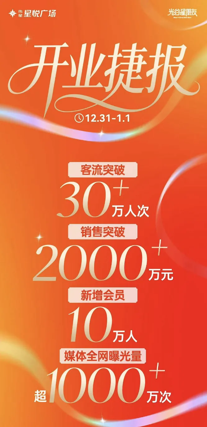 2025年12月31,武汉武汉伟星星悦广场开业,定位为“一站式家庭欢乐中心”,建筑面积12万平方米,目前已引进悦活里超市、博纳IMAX院线影城、卡希尔家庭娱乐中心等超230个品牌,其中超80家品牌是首次进驻光谷南部,涵盖零售、餐饮、娱乐、亲子等多元业态。