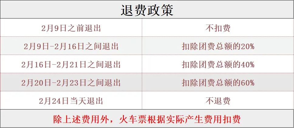 如遇天气自然灾害等不可抗拒因素以及不成团等因素,客服将提前通知全额退款或改期,报名即视为同意本规则。成功报的人员,如自身原因需要退团,应当提前说明并按以下损失: