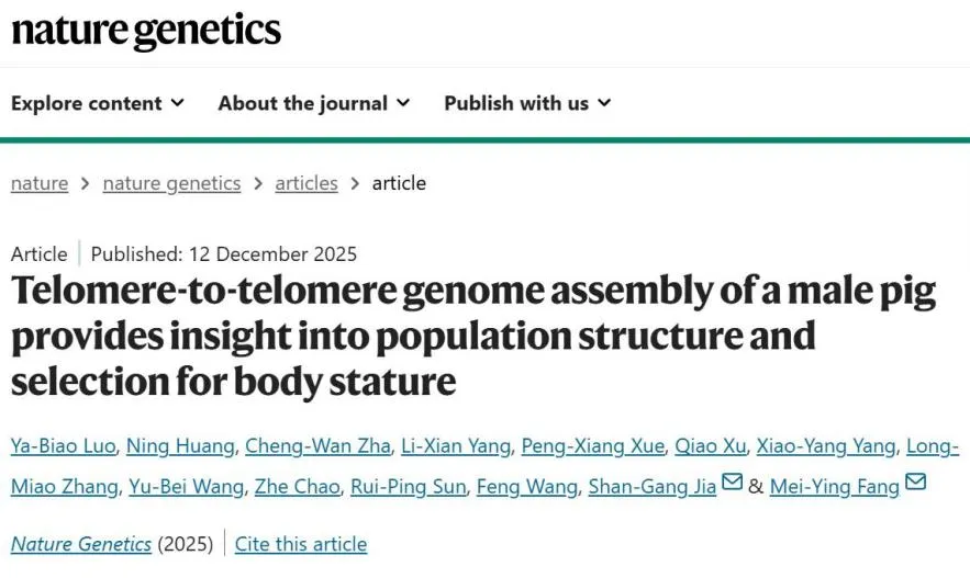 中国农业大学动物科学技术学院方美英教授团队在国际知名学术期刊《自然·遗传》(Nature Genetics)发表开创性研究论文《公猪T2T基因组组装为群体结构与体型选择研究提供了新见解》(Telomere-to-telomere genome assembly of a male pig provides insight into population structure and selection for body stature)。该研究首次完成了中国五指山小型猪端粒到端粒无间隙基因组组装(T2T-pig1.0),其中包含完整的Y染色体和着丝粒区域。