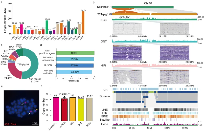 本研究整合169.8 Gb超长ONT(65.31×)、192.4 GbPacBio HiFi(73.98×)、1113.8 GbBionano光学图谱数据、267 GbHi-C数据(100×),以及133.7 Gb二代测序(50×)数据,构建了一个2.63 Gb,QV值达到51.41的无缺口T2T基因组(T2T-pig1.0)。与现有参考基因组Sscrofa11.1相比,T2T-pig1.0新增解析区域194.42 Mb,其中包含1189个基因。