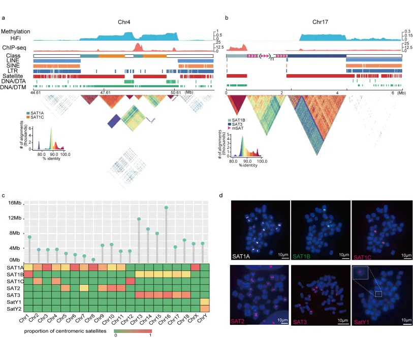 综合利用染色质免疫共沉淀测序(ChIP-seq)、HiFi甲基化信号以及着丝粒卫星序列,本研究鉴定出总长度约为107.3 Mb(占T2T-pig1.0基因组的4.0%)着丝粒区域。重复序列注释显示,五种着丝粒卫星重复单元(SAT1–SAT3、SatY1和SatY2)在着丝粒区域中占主导地位;这些卫星单元表现出明显的染色体分布偏差。其中,SAT3仅定位于六条端着丝粒染色体的着丝粒区域,并与微卫星序列“AGAAT”(mSAT)和SAT1B呈现独特的端着丝粒特异分布模式:“telomere-SAT1B-(mSAT)n-SAT3-q_arm”。此外,研究发现了猪着丝粒中存在独特的DNA转座子和LTR入侵。上述结果为猪着丝粒图谱绘制和结构特征解析提供了新的视角。