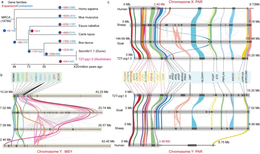 T2T-pig1.0实现完整无缺口Y染色体组装,长度为43.25 Mb,相比Sscrofa11.1版本的ChrY新增了29.64 Mb此前未解析序列;同时鉴定出两种新的ChrY特异着丝粒重复SatY1(5660 bp)和SatY2(2472 bp)。跨物种比较分析揭示,五指山猪与杜洛克猪约在210万年前分化。T2T-pig1.0中有541个基因家族扩增,这些扩增基因显著富集于“细胞大小负调控”和“器官生长负调控”等通路,可能与五指山猪小体型性状相关。此外,猪、人、山羊和绵羊四种大型动物的T2T性染色体比较表明,不同物种的ChrX与ChrY在PAR和MSY区域维持较高共线性,可能具有共同进化起源。