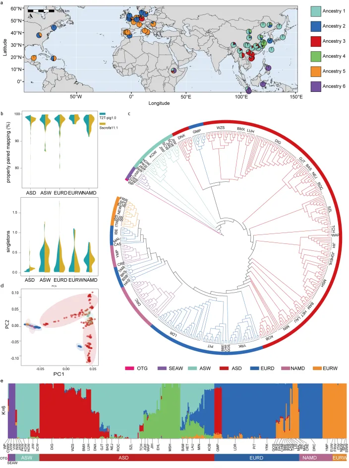 基于T2T-pig1.0参考基因组,本研究对来自60个品种、覆盖亚洲、欧洲和北美的407份全基因组测序数据进行了群体遗传分析。与Sscrofa11.1相比,T2T-pig1.0的比对准确性显著提升,错配率和未配对读段数量均减少。以T2T-pig1.0为参考共检测到约1785万个SNPs,其中1.9%位于PUR区域。PUR区SNPs在亚洲和东南亚群体中以低频等位基因为主,在欧洲和北美群体中趋于固定。基于这些SNPs构建的系统发育树、PCA及群体结构分析结果揭示,亚洲家猪由三种主要祖源成分构成,且东北亚猪群中存在欧洲家猪的遗传成分;基于T2T-pig1.0的分析更精准地揭示了家猪群体的遗传结构及亚洲猪群间的基因渗入关系。