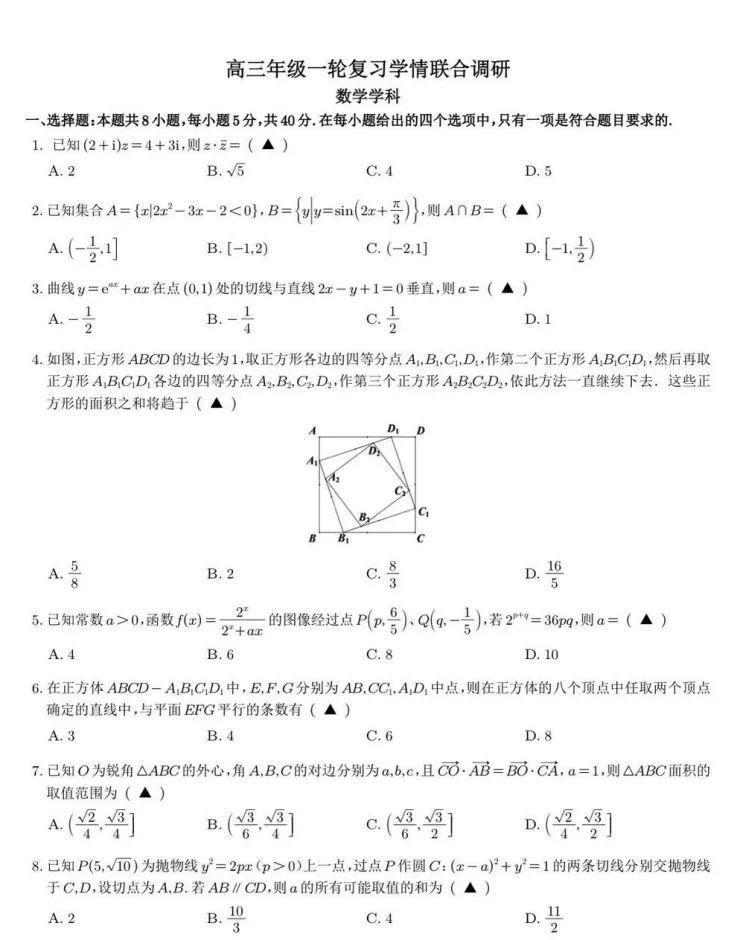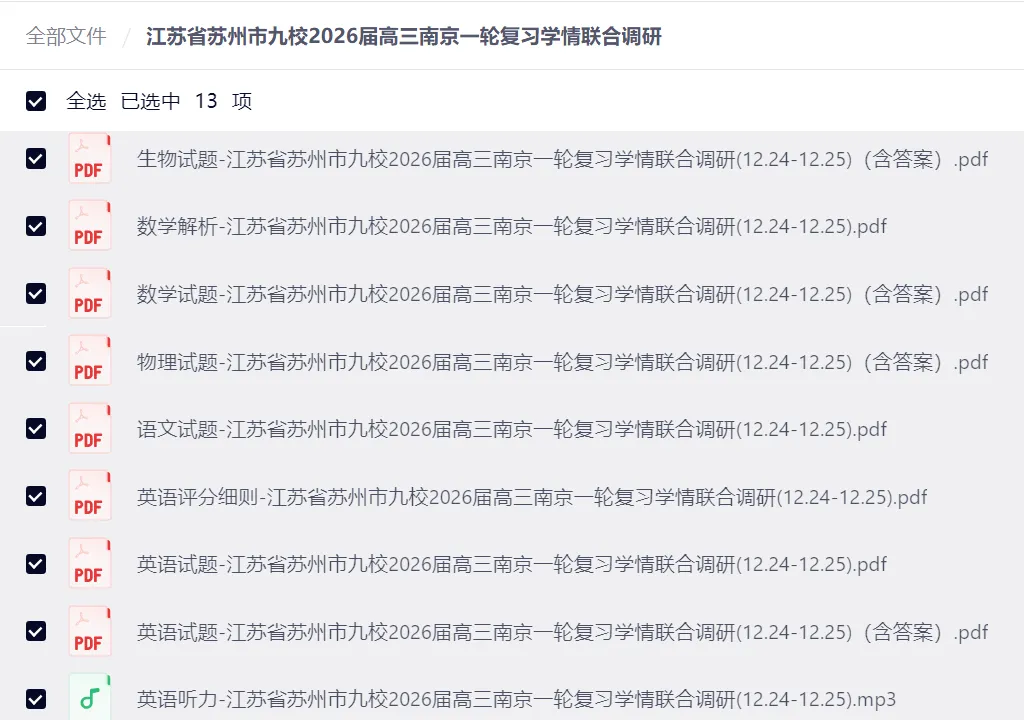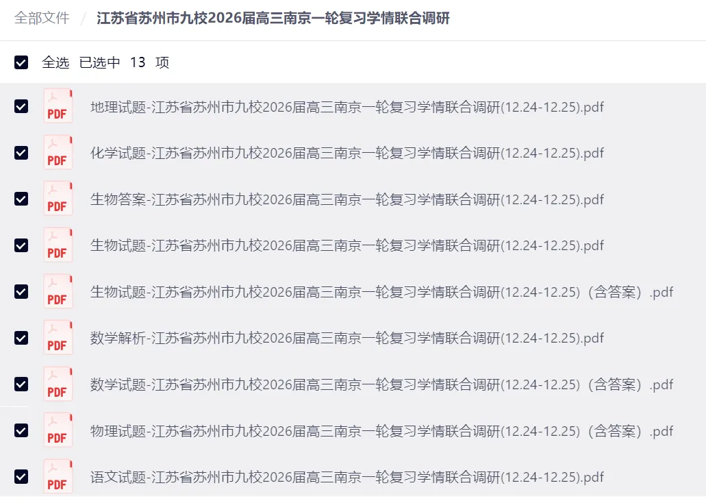 江苏省苏州市九校2026届高三南京市一轮复习学情联合调研及参考答案【全9科】试卷含答案,网盘免费分享【可下载pdf版】