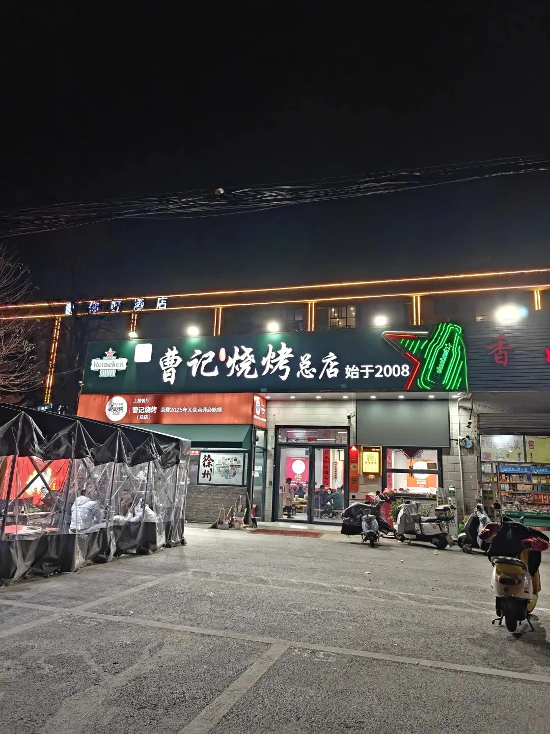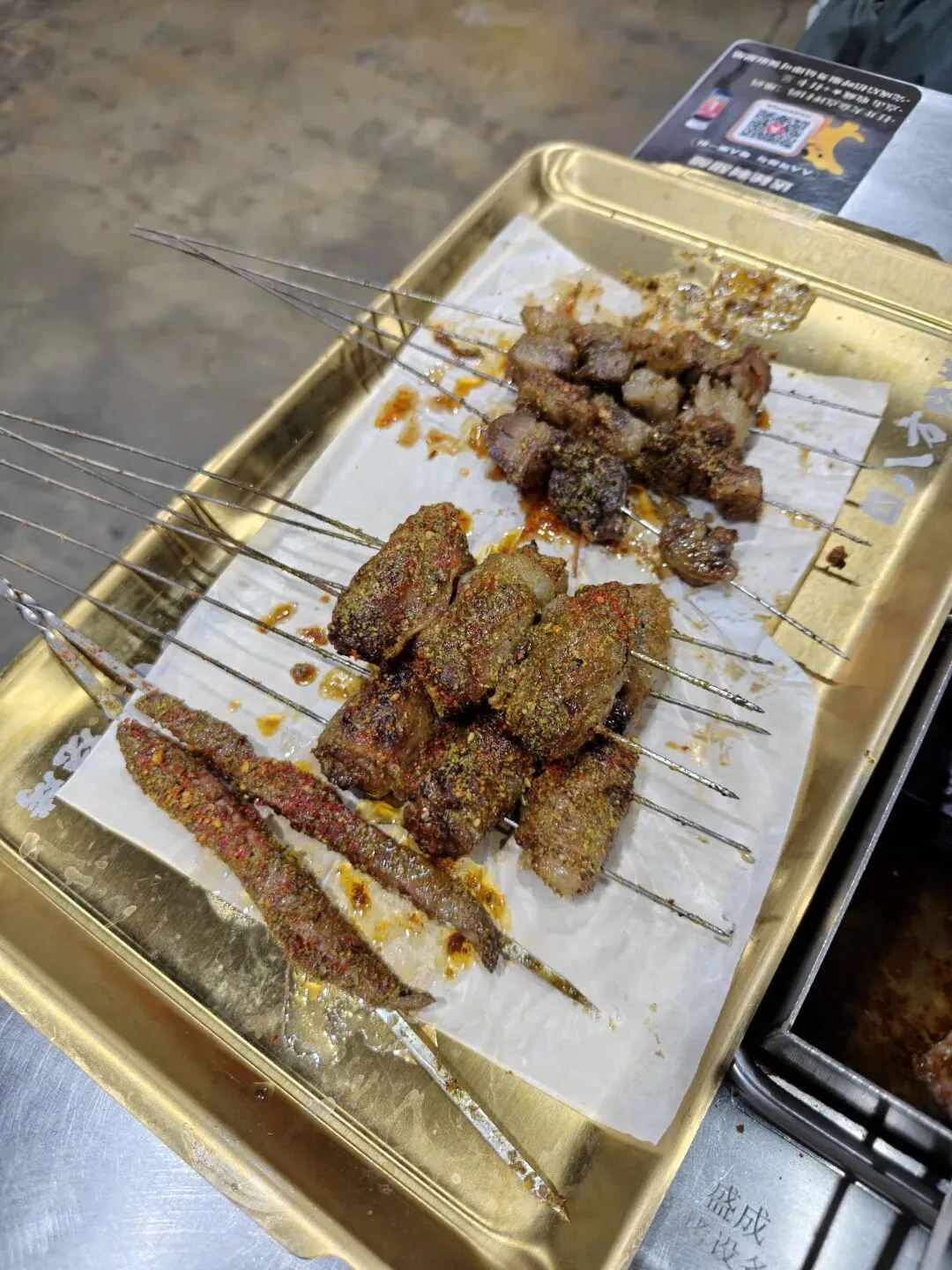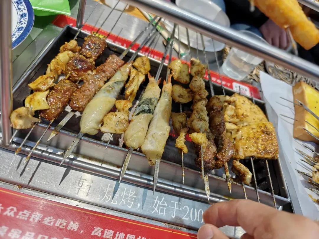 没吃过这种介于豆干和豆腐之间的臭豆腐,挺臭,口感像鸡蛋干,调味又辣又甜,还挺清爽,这就是鲁苏皖豫走到一起来的味道吗!徐州烧烤是烤七分熟,上来再自己烤一会儿,对饿鬼来说太延迟满足了。可以蘸甜醋,挺特别,也挺解腻,我们还是主要吃辣椒面了。第一顿都吃得非常收敛,还在互相揣摩食量。