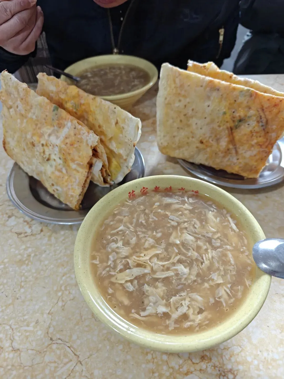 我在窗口探头探脑看了半天,原来是一层一层熟的薄饼再加蛋烙脆,跟天津煎饼用面糊并不是一个逻辑。四个人(含三个健身男)吃三套二饼一蛋都没吃完,我在北京经常吃不饱,在徐州经常吃不下……面筋汤又是胡椒味的勾芡汤,感觉西楚霸王早上起床也得吃这个,过。早餐吃得很满意,了却我一桩心愿。