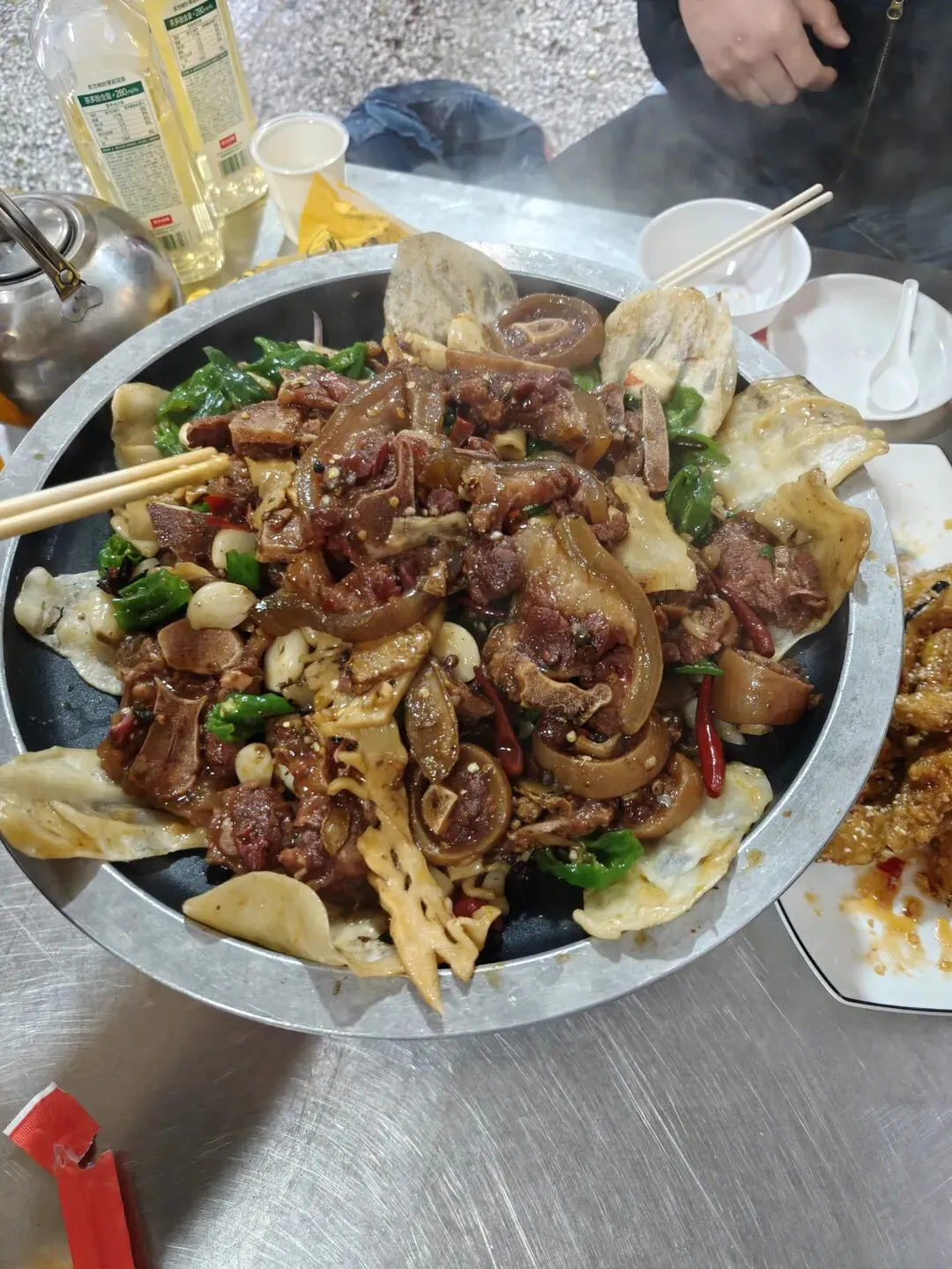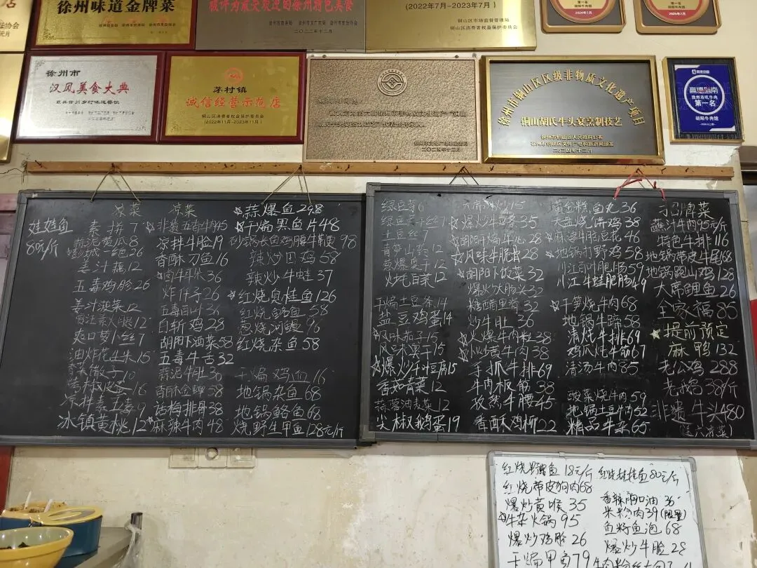 今天的游览活动是我想去的两个汉墓,先打车去龟山汉墓。可见人还是应该骨灰扬了,白茫茫一片真干净。又要厚葬又不想被刨尸就要得太多了。大概20分钟就出来了,也觉得这么小收68块钱门票不合适,旁边配套一个点石园。咋说呢,这个馆鲁味好浓啊,大爹味儿打得我头晕目眩。我打开地图看了看,离我外公的山东老家不过百余公里,真是,鲁得我有点难受了。开到门口,一个前不着村后不着店的快速路边,但是停满了车,人声鼎沸。三个男的本来将信将疑的被我带到了村里,要是不好吃我导游的一世英名(并不多)将毁于一旦。进门就喜笑颜开,左边在卖麻辣牛肉,右边在蒸巨大的牛肉粉丝包,服务员忙得脚底板打后脑勺,根本没空搭理人。不管味道如何,这热火朝天的气氛是挺到位了。不好吃也是人民群众的责任,肯定不能赖我了!我觉得像锅包肉的茄子版,但我并不懂锅包肉……反正就是裹面糊油炸,酸甜口的,还挺好吃。单吃倒也还好,后来被火爆牛肉粒辣得七窍生烟,真的很需酸甜菜解辣,迅速光盘。带皮牛尾确实没吃过,这个菜的味型就挺鲁菜酱香的,但是又更辣,酱香很容易做得只咸没有什么层次,这个调味还挺好。这菜真的让我对徐州的辣肃然起敬,里面起码用了三种辣椒,而且牛肉真的是粒,很难挑着吃,标准吃法是烙馍卷着吃,必须吃下很多辣椒。好像是煮熟了浇汁,我只尝了一口,虽然不腥但也不入味儿。调味还可以,本西南人至今不能接受鲤鱼的口感,弃之可惜食之乏味。吃得有点晕碳,又辣得缺氧,打车去白集汉墓。