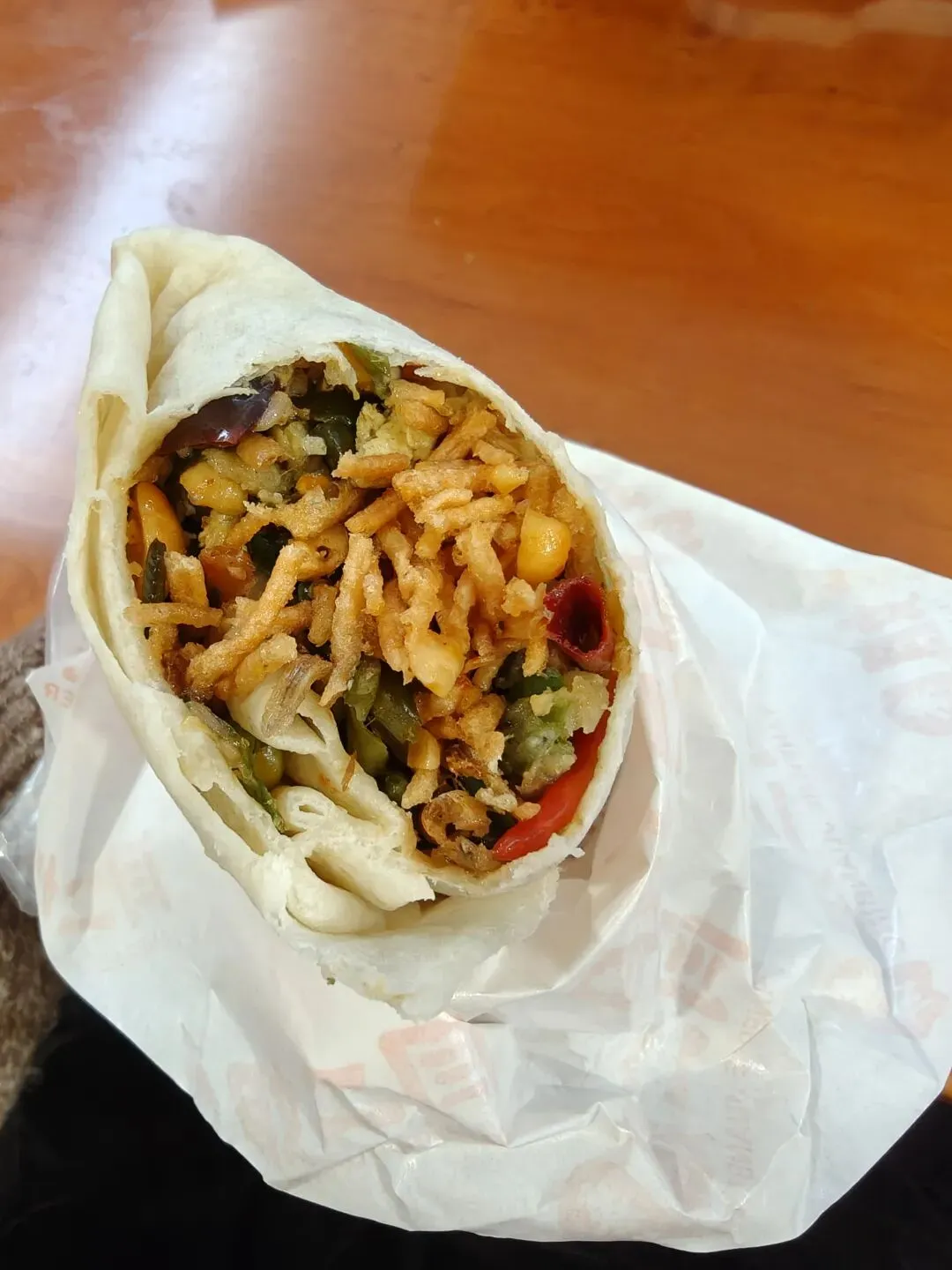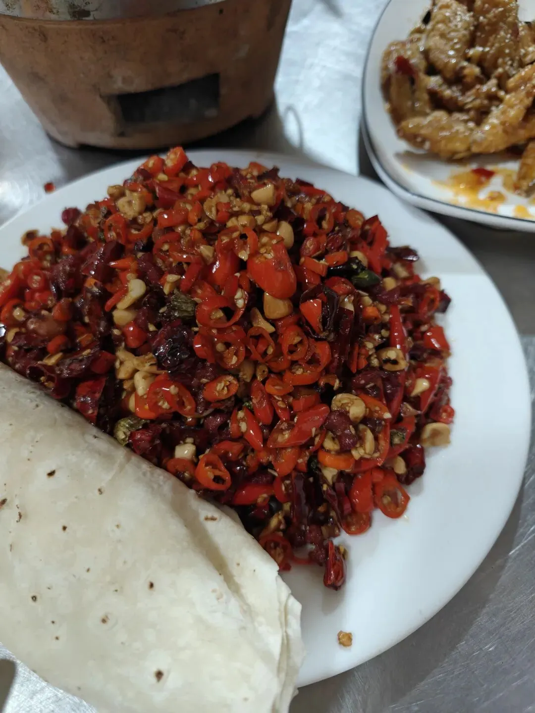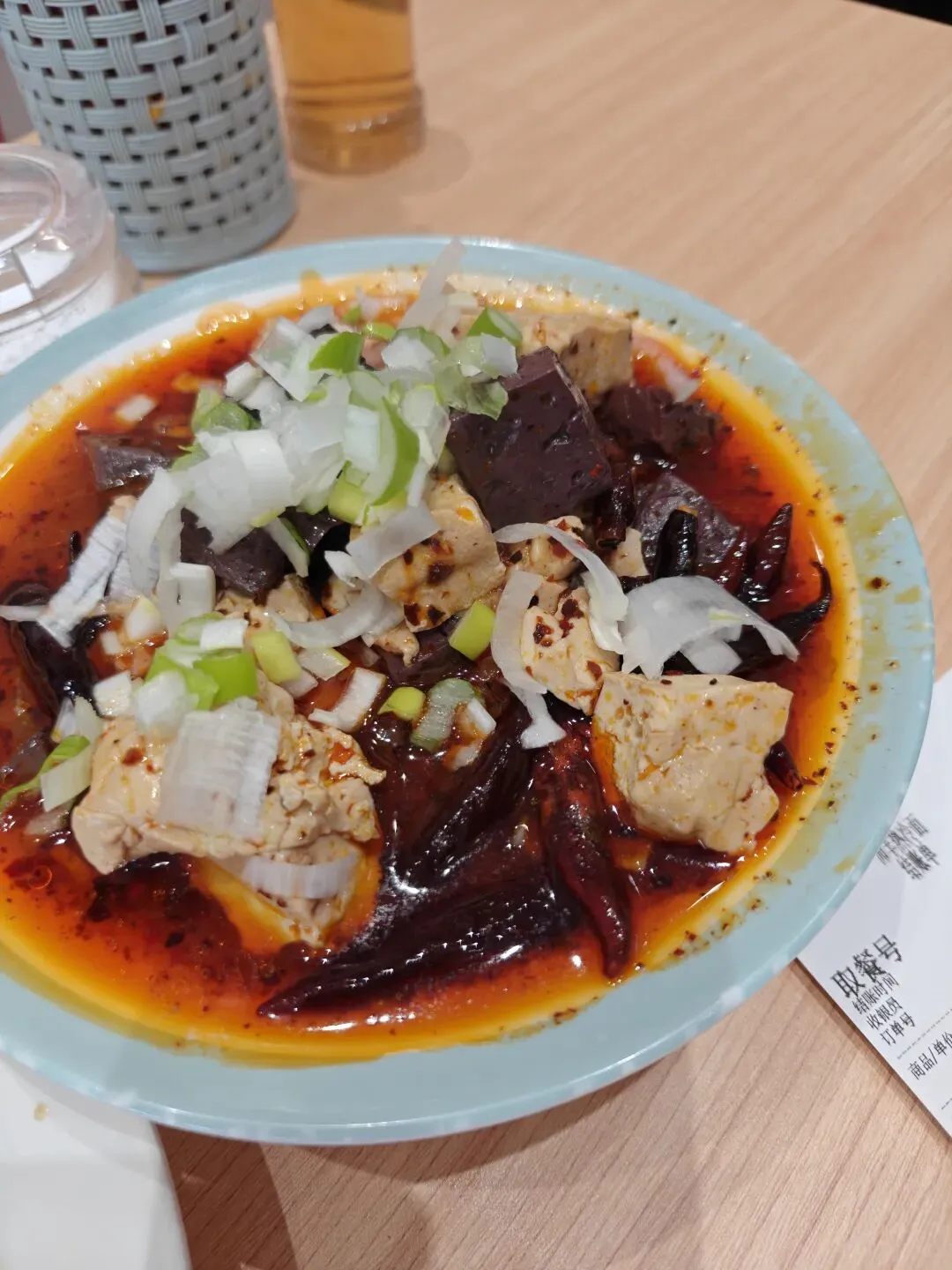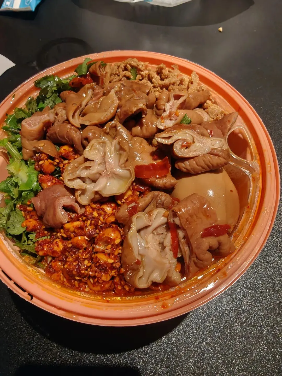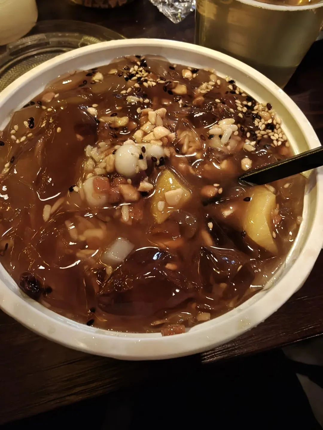 加了绿豆芽,海带丝,辣炒小鱼小虾,辣椒炒鸡蛋,辣椒疙瘩,忘记加撒子了。好大一个啊!很像我外婆爱做的东西,烙饼卷一切。原来我外公就是爱吃这个东西!我从来没吃过料这么足的冰粉,好大一份,像吃八宝饭!挺新鲜,但我觉得这个食材不太适合酱烧, 因为味道进不去外面又太咸。十几年前老在二七剧场路的龙人居吃干煸肥肠,后来这个菜没了。端上来河虾还在里头使劲儿蹦跶,挣扎了十分钟才断片儿。甜醋葱姜蒜味儿的,不放辣椒我吃着就稍微有点甜了,不过还是吃了不少,因为我很多年没有吃过鲜活的河虾了,徐州物产挺丰富,啥都有。吃完去西楚喝了一杯,飞哥点了一杯三倍浑浊,比晶状体都清澈,怀疑进错酒了,老板娘否认。