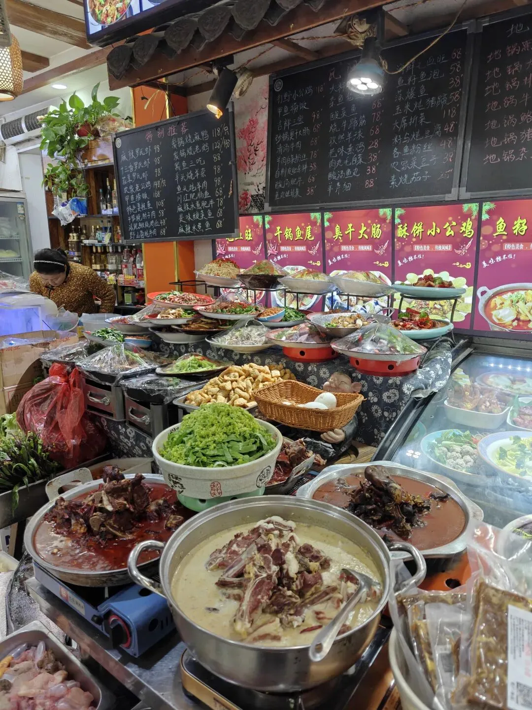 中午要吃把子肉,我无福消受,但我不能吃亏,起来先给自己点了个阿喆米线。他们不仅点了把子肉还点了东坡肉,这吃完不上山打老虎还能干啥??米饭自取,浇上一勺肉汁一勺蒜汁,给他们仨吃得眼睛冒星星,神志恍惚。老陈香迷糊了还惦记着小姨子——他心目中的五花肉伯乐,指示我赶紧发给她看看:“还有蒜汁儿!徐州人很懂!我妹肯定爱吃!你不懂!”根据我的观察,徐州的把子肉功能类似于牛肉面,就是吃快餐,每家人都挺多,应该都挺好吃。与五花肉八字不合的我,去马路对面的推车买滕州菜煎饼吃。胡乱夹了一盆菜,大爷说我选得太少了,又夹了一大堆。确实选得有点少……都不像徐州的量了,下次还是得让大爷给我配菜,放弃主观能动性。挺好吃的,要是我家楼下有一个多好,懒得做饭就有饭辙了。然后干什么呢,本来打算去徐州博物馆,但我磨蹭了两天没预约就没号了。(可见也不是真的想去)planB是去汉画像石艺术馆,但是昨天在白集看挺多,感觉有点重复。从KTV 出来已经天黑了,雾霾还挺重,街上真是无聊啊,比北京的街还无聊的地方很少见。甚至还去教堂逛了一圈。昨天两个司机都强烈推荐大黑碗,大家都认为必须去见识一下。我们想象中的木桶大概是个小木桶,上来是个婴儿澡盆大小……不辣,都是苏北,徐州对十三香的运用胜过盱眙不少嘛。真是海纳百川的口味啊,麻辣口味也做得很好,不得了。这家大家都很满意,我也很满意,因为电视一直在放灌篮高手。这个鸡皮紫苏虾跟油包肝有异曲同工之妙,烤到鸡皮焦香,虾还是弹牙的不会过熟,口感很搭,还有一点紫苏叶的味道,很会利用油脂!刷了辣油的烙花卷,脆脆的油香味还有葱香味,这里的葱还甜甜的……我的山东DNA 都动了!服务员说素拼凉菜是一人份,上来傻眼了,这在北京可以分成五份。首先是热的,也不是荞麦面,跟东北冷面一点关系没有,为什么叫冷面啊。汤底是羊肉汤,吃起来就是单县羊肉汤的味儿,辣椒也是羊油辣椒。大冷天吃着很暖和。按道理来说应该是我爱吃的,可惜调味用了整粒孜然,我不太喜欢,孜然味太大了。傍晚到家掏出早上点的卷饼,这次记得加撒子了,我可真是个机灵鬼!还是没吃完,好啦好啦,我只是一个食量普通的中年人罢了!