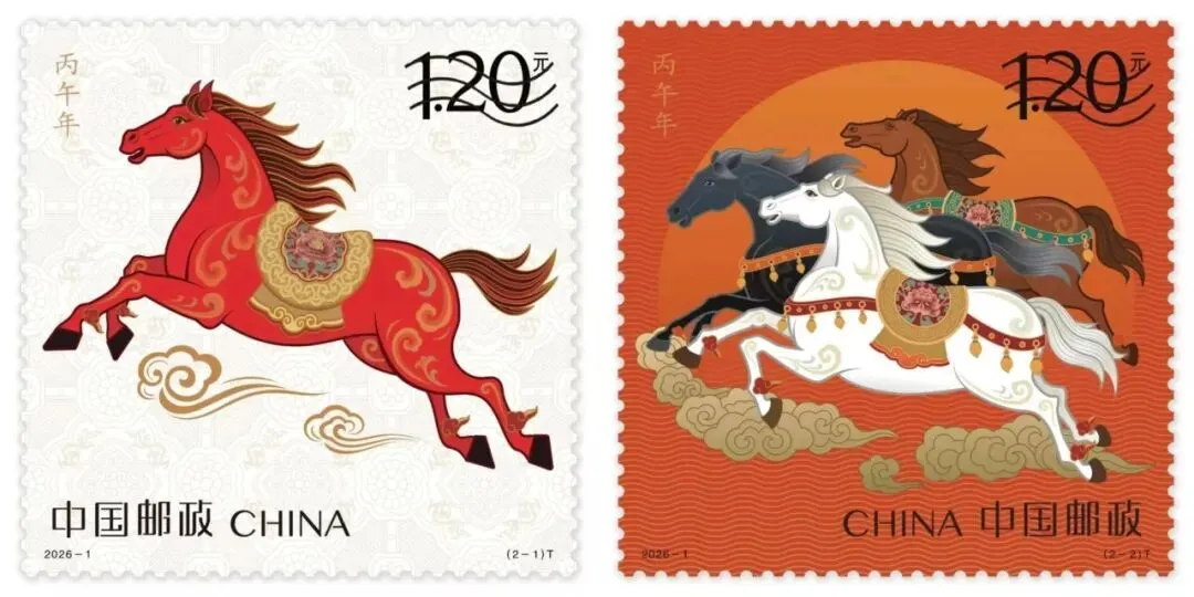 本次首发的《丙午年》特种邮票,由王红卫、赵恩重两位设计师精心创作,第一枚“驰跃宏图”中,红马驰骋祥云之上,尽显开拓奋进之姿;第二枚“万骏臻福”里,三匹骏马齐奔向前,寓意众志成城、福运绵长。