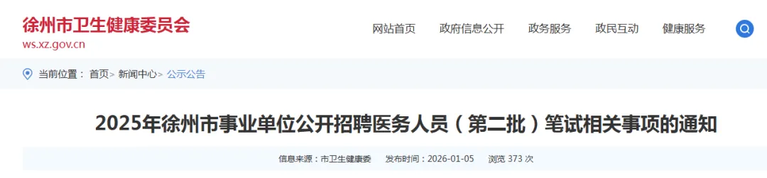 根据《2025年徐州市事业单位公开招聘医务人员(第二批)公告》,经研究,现将2025年徐州市事业单位公开招聘医务人员(第二批)笔试有关事项公告如下: