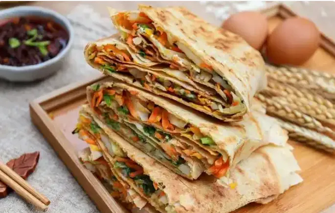 薄薄脆脆的煎饼放上各种各样的菜再在那饼扛子上一热简直好吃到爆!