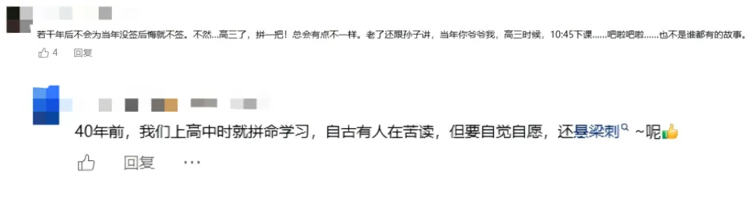 “若干年后不会为当年没签后悔就不签。不然……高三了,拼一把!总会有点不一样。老了还跟孙子讲,当年你爷爷我,高三时候,10:45下课……吧啦吧啦……也不是谁都有的故事。”