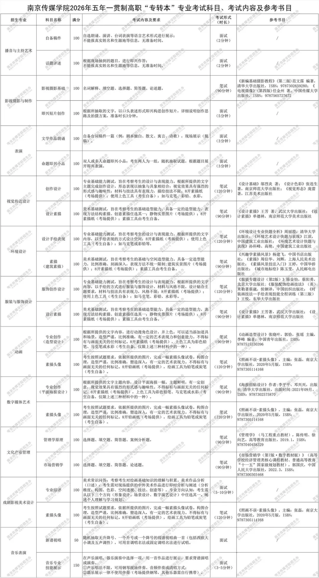 >南京传媒学院2026年五年一贯制高职“专转本”专业考试科目、考试内容及参考书目