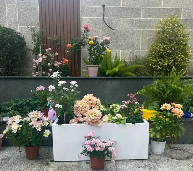 她不是乱种的 , 按照每种花的习性来排 , 有的喜阳就放外面 , 有的怕晒就往里挪。 花丛里还摆了些石头、小木雕 , 不刻意 , 但看着很舒服。