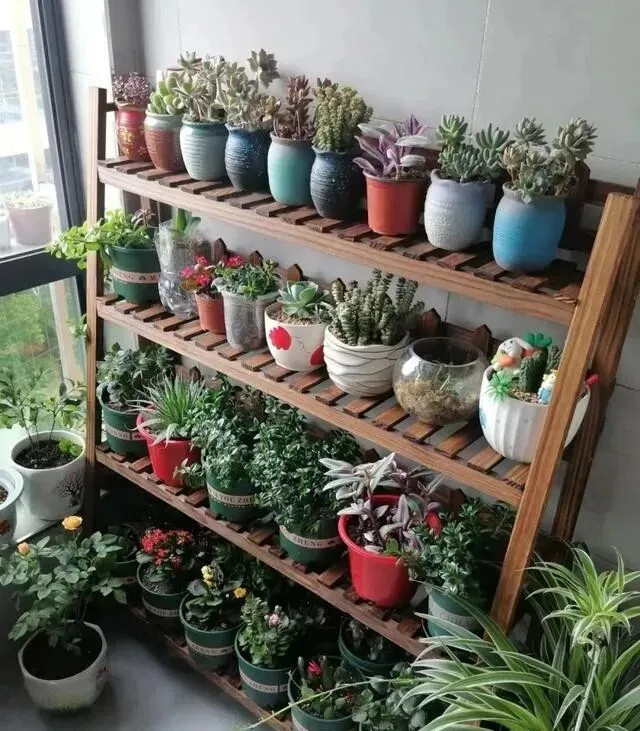 但大爷玩出花了 , 他不光往地上摆 , 还往上发展 , 让多肉顺着栏杆爬 , 垂下来那种 , 空间一下就活了。