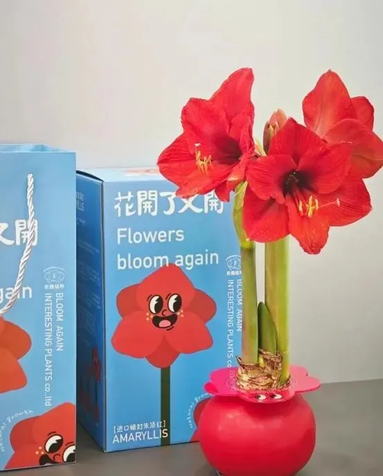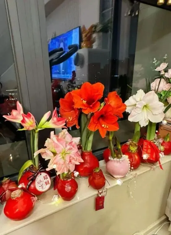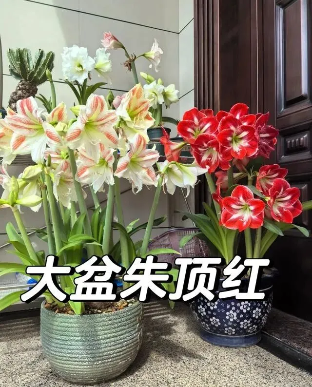 朱顶红这东西 , 谐音"注定红" , 每年春节前后特别抢手 , 寓意好 , 红红火火的。