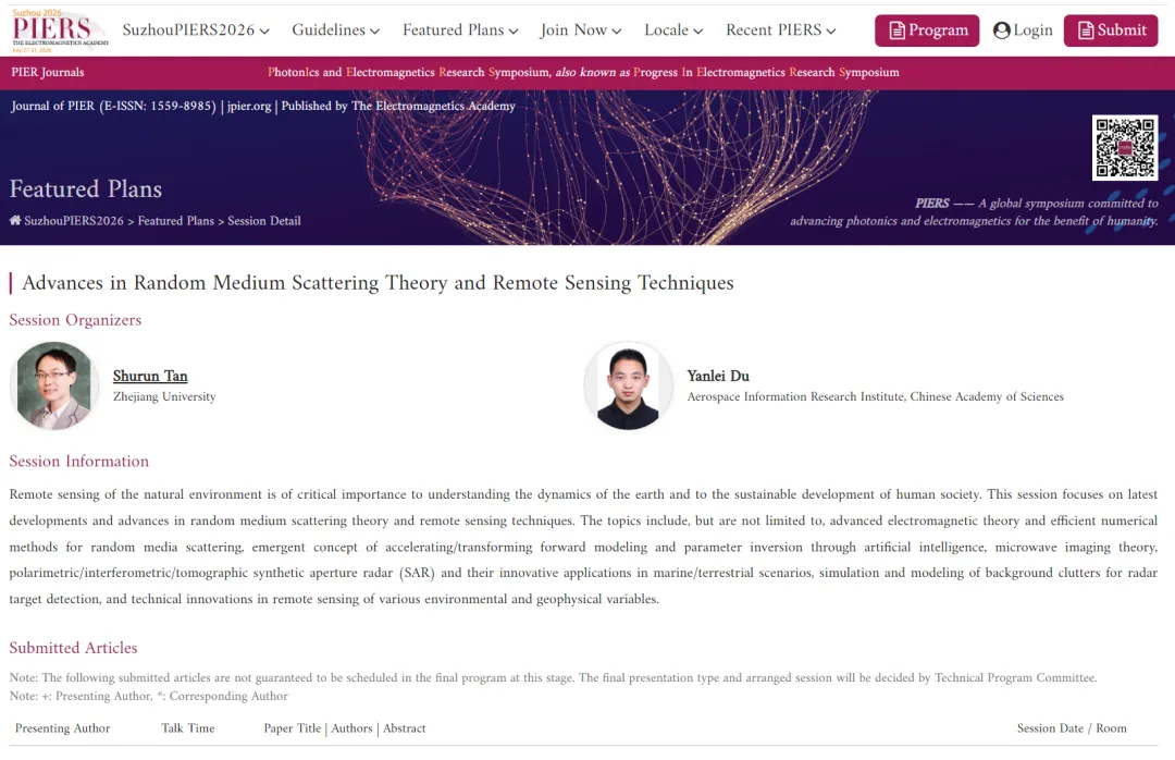 光子学与电磁学研究研讨会(PIERS) 是一个致力于推动光子学与电磁学发展、造福人类的国际盛会。PIERS 2026 将在中国历史文化名城——苏州举行。我们诚邀全球学者齐聚于此,分享最新研究成果,探讨前沿科学问题。本次会议设有众多专题分会,其中 “Advances in Random Medium Scattering Theory and Remote Sensing Techniques” (随机介质散射理论与遥感技术进展)分会现正式公开征稿。