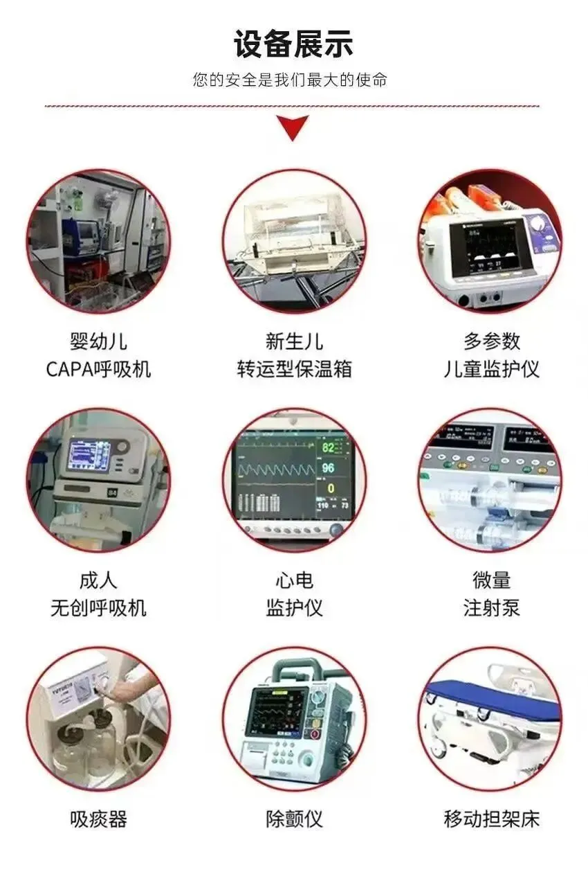 【设备保障】每车配备:✔ 智能呼吸系统✔ 多参数监护设备✔ 心脏急救设备✔ 精密输液系统✔ 气道管理设备✔ 消毒隔离系统✔ 供氧系统✔ 急救药品