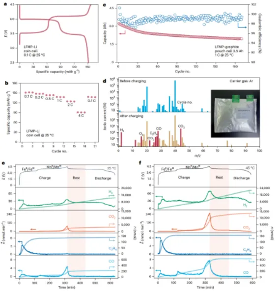 图1:LFMP电池的电化学性能和气体析出。a,b,纽扣电池中LFMP-锂半电池在25 ℃、2.5-4.5 V范围内0.1C时的充电-放电曲线(a)和倍率性能(b)。c,LFMP-石墨3.5 Ah袋式全电池在1 C、25 ℃、2.5-4.35 V电压范围内的循环性能。d,充电过程前后LFMP-石墨袋式电池中气相的质谱比较。e,f,在25 ℃(e)和45 ℃(f)下首次充电和首次放电期间LFMP-石墨全电池的原位单流DEMS。