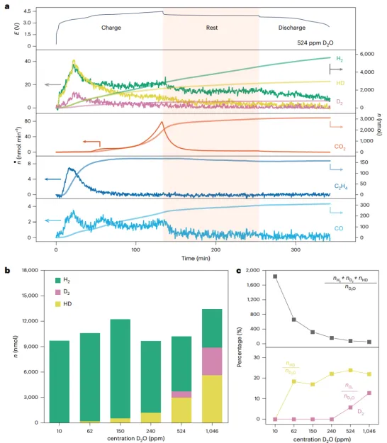 图2:电解液中水浓度对氢气析出的影响。a,LFMP-石墨电池首次充电和首次放电过程中的气体析出,电解液中含有524 ppm D2O,温度为25 ℃。速率:0.4 C。b,使用具有各种D2O浓度的电解质的电池中的H2、HD和D2析出量的比较。c, D2O浓度对氢析出比率的影响。
