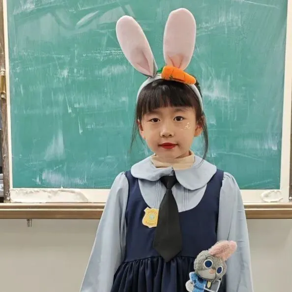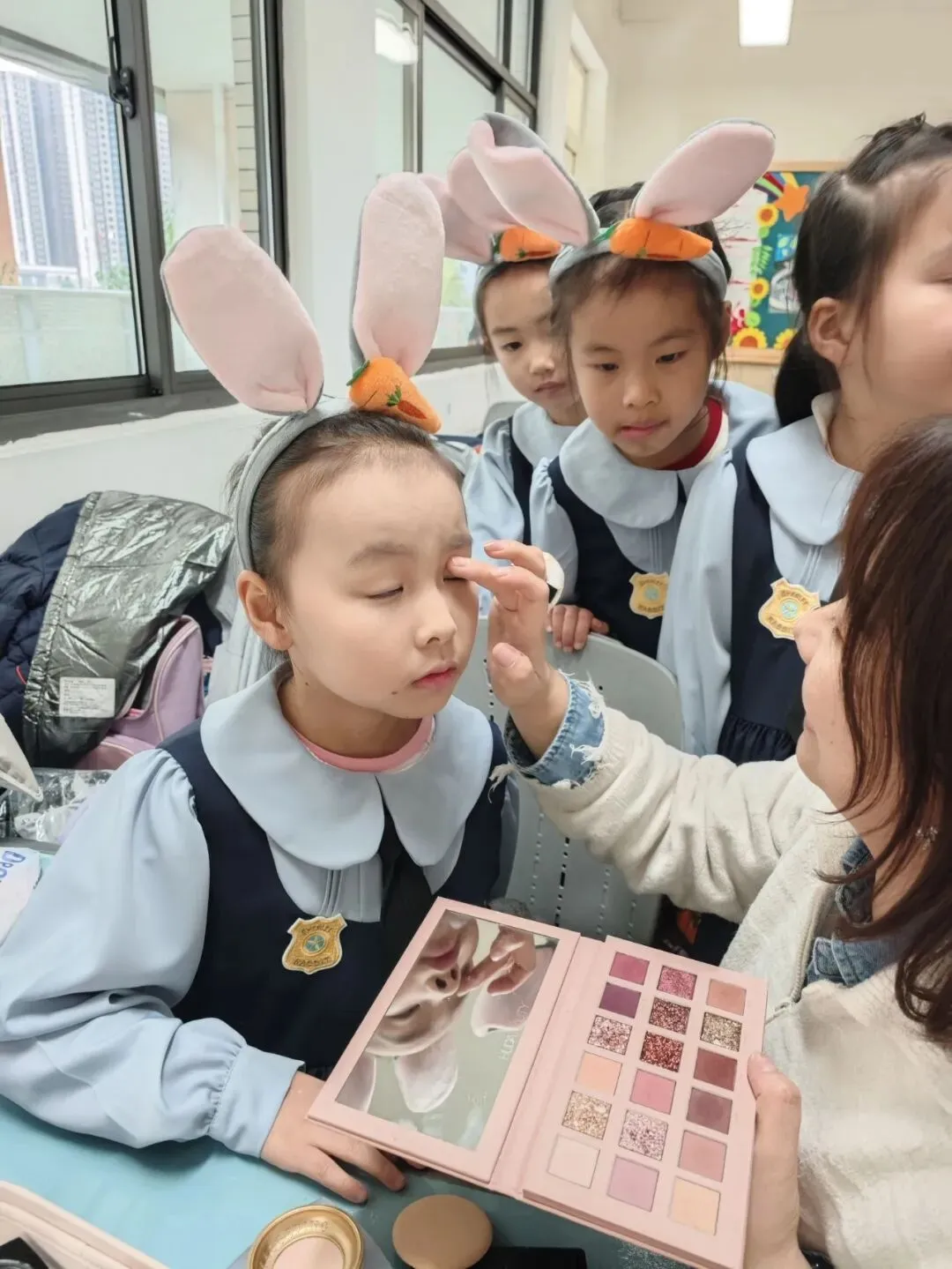 演出当天,教室变成了临时 “化妆间”。家长志愿者们化身 “造型师”,为孩子们精心化妆、整理服装。粉底、腮红、眼影一层层涂抹,可爱的动物头饰、鲜艳的演出服一一上身,原本活泼的小朋友们,瞬间变身成了《ZOO》里的 “小萌兽”—— 灵动的小兔子、帅气的小狐狸 !看到自己的新造型,孩子们兴奋地互相打量,眼里的期待更是藏不住,这份对舞台的向往,让整个 “化妆间” 都充满了欢乐与温馨。